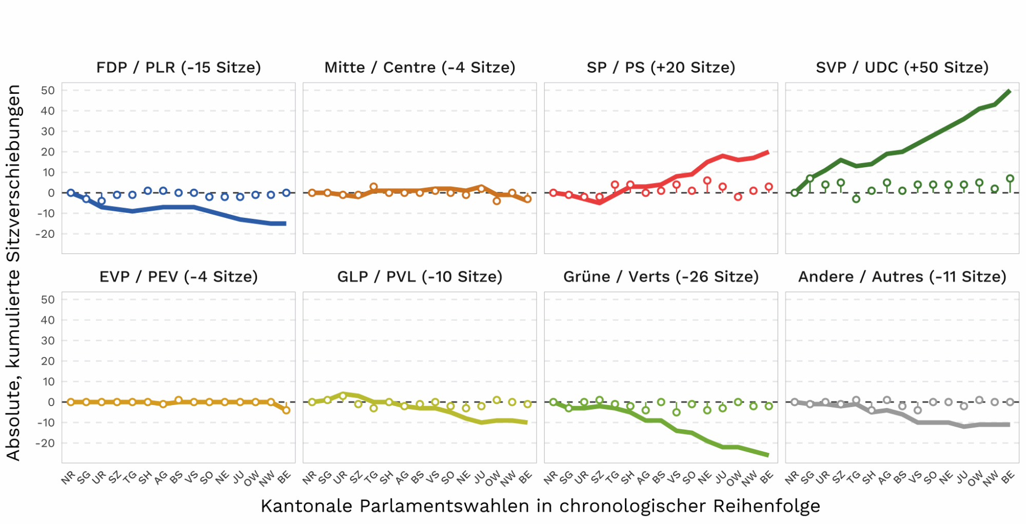 Punkt: Sitzverschiebung gegenüber der letzten Wahl im selben Kanton; Linie: kumulierte Veränderung. Daten: BFS (Nr. je-d-17.02.05.01.03). Stand: 02.04. 2026 · Abbildung: Sophie De Stefani, DeFacto