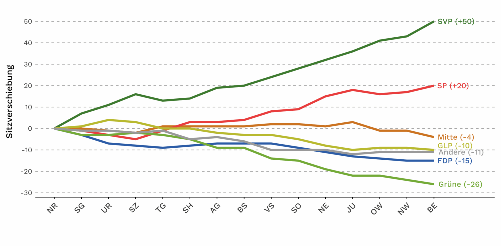 Gleichzeitig verlieren die Grünen in der grossen Mehrheit der Kantone Sitze, ebenso wie GLP und FDP. Die Zugewinne der SP vermögen diese Verluste im links-grünen Lager nicht auszugleichen. Das Resultat ist keine gleichmässige Stärkung beider politischer Pole, sondern eine Verschiebung des Gleichgewichts nach rechts.